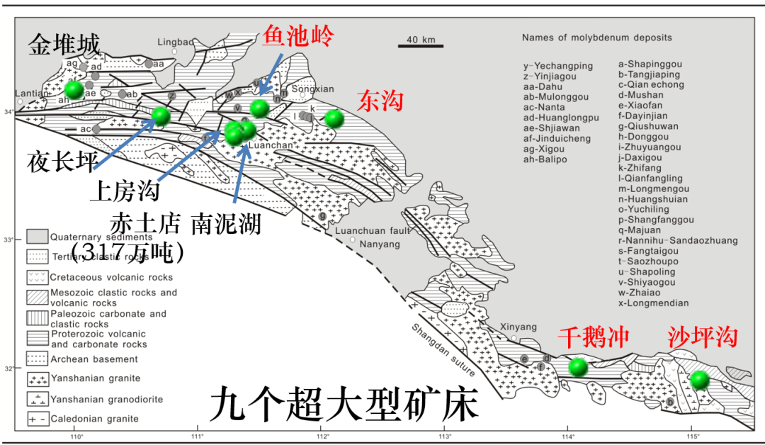 秦岭是中国钼最多的地区,有九个比较出名的超大型钼矿床:沙坪沟;千鹅冲;东沟;鱼池岭;南泥湖;赤土店;上房沟;夜长坪;金堆城。该地区矿床以斑岩型、斑岩-矽卡岩型、矽卡岩型、脉型为主,主要为三叠纪、早白垩世成矿。