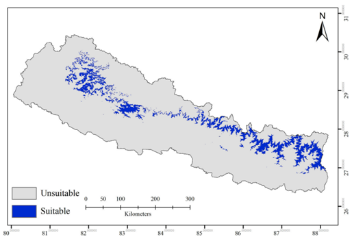 图3尼泊尔境内潜在的小熊猫栖息地(以蓝色标识)(Thapaetal., 2020)