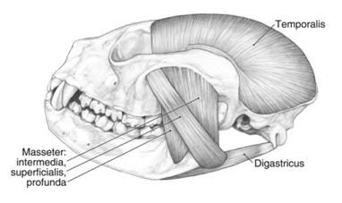 Temporalis:颞肌;Digastricus:颚二腹肌;Masseter:咬肌,分为中部(intermedia)、上部(superficialis)和下部(profunda)三部分