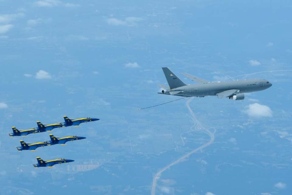 美国空军的KC-46加油机再给美国海军“蓝天使”表演队的F/ A -18“大黄蜂”加油。美国空军是硬管加油,美国海军是软管加油,KC-46有两套系统,之前由于KC-46本身系统的问题,没法使用软管系统为海军系统加油,2021年7月9日美国空军空中机动司令部才尝试性的开放这一功能。
