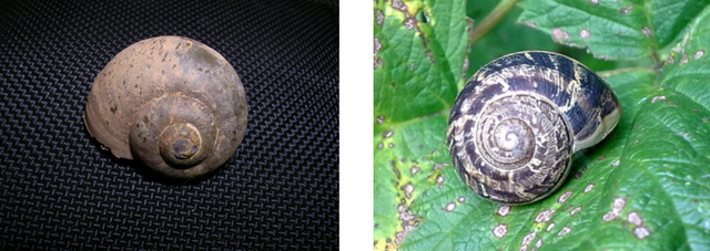 一个单纯的spiral可以是顺时针的,也可以是逆时针的。一个平面上的spiral其实无所谓顺时针还是逆时针的,因为换到另一侧看顺时针就变成了逆时针的。一些蜗牛身形是关于平面对称的,它们的螺线本质上是二维的,所以无所谓其螺线是顺时针还是逆时针的, 左旋的还是右旋的(图8)。具有锥形 spiral 外观的蜗牛就不一样了,它的螺旋性具有了绝对的意义(图10)。按说,η=±1两种螺旋性是对称的,没什么差别,蜗牛应该左旋、右旋各半才对,而实际情况是一种蜗牛大多只有一种螺旋性,不同种的蜗牛会两种螺旋性都有。什么使得螺旋对称性破缺了呢?有趣的是破缺机制不在生长层面之下,而在其上。不同手性的蜗牛的器官是镜面对称的,这使得不同手性的个体之间的生殖力学变得艰难。这样经过自然选择以后,一种蜗牛就差不多剩下一种螺旋性了。如果是植物的话,就没这个问题。与动物不同,植物的生殖行为不会受其个体对称性(matching的需求)影响,因此其左旋和右旋出现几率各半,如松果的斜列螺旋(图11)和微纳米自组装的斜列螺旋[6]。