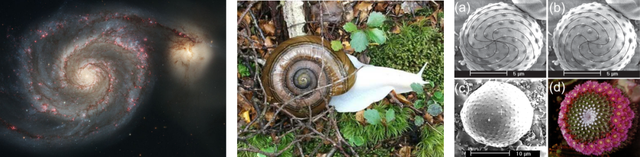 图8. Spirals. 从星系,厘米大小的蜗牛到微米大小的应力自组装点阵[5,6]都表现出螺旋结构。