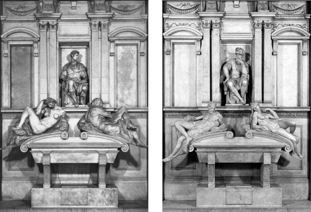 图4. Michelangelo雕塑里的二值世界 (左与右,男与女,欢乐与忧愁,神界与尘世)。