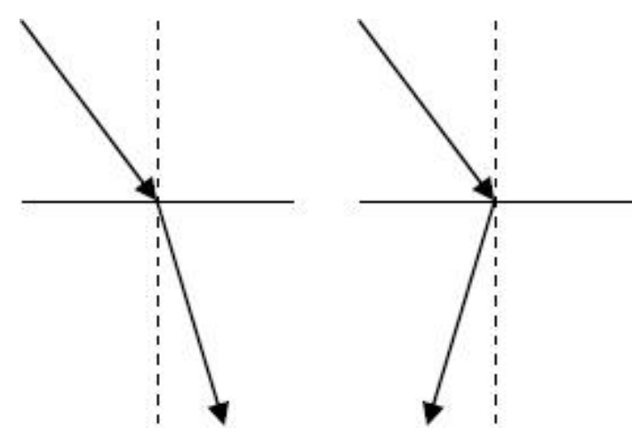 图6. 光在正常材料(左图)和左手性材料(右图)表面上的折射
