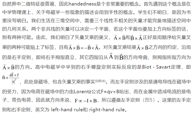 小时候(上世纪七十年代)念书,那时候在穷乡僻壤能见到的就那么几本书,常常遇到一些跟左右有关的概念,比如“左倾冒险主义”、“左倾盲动主义”、“左倾机会主义”, 以及“右倾机会主义”、“右倾投降主义”,“右倾分裂主义”(毛泽东《实践论》,1937),等等。机会主义有左有右,有些人还竟然形左实右、假左真右,那么到底哪样是左,哪样是右,实在不是我们这些乡下穷孩子掰手指头能分清楚的。及至稍大一点学物理,又遇到了什么左手感应定则,右手螺旋定则,再后来又有了螺旋性(helicity还是spirality?)、手性(handedness还是chirality)、 polarization注释(2)和宇称(parity),更是觉得这些关于左右的概念还真是个严肃的问题。