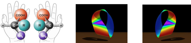 图12. 手性的存在 (chiral objects)。氨基酸属的两种对映体7)和Möbius带及其镜象。