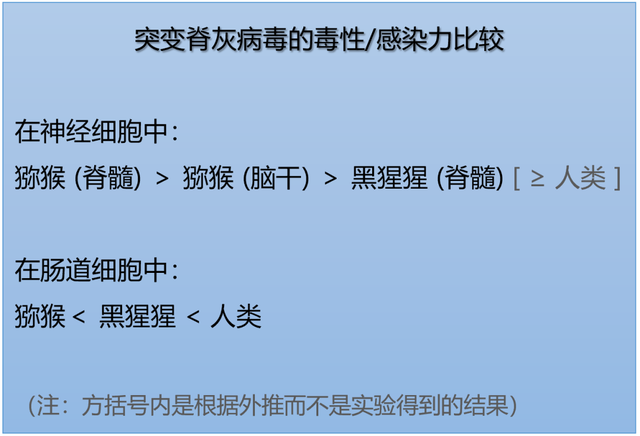 换句话说,人类神经细胞对脊灰病毒的易感程度应该不会高于黑猩猩,所以对黑猩猩的神经细胞没有毒性的疫苗病毒,对人类应该也是安全的。实际情况是否如此?只有经过试验才能知道。