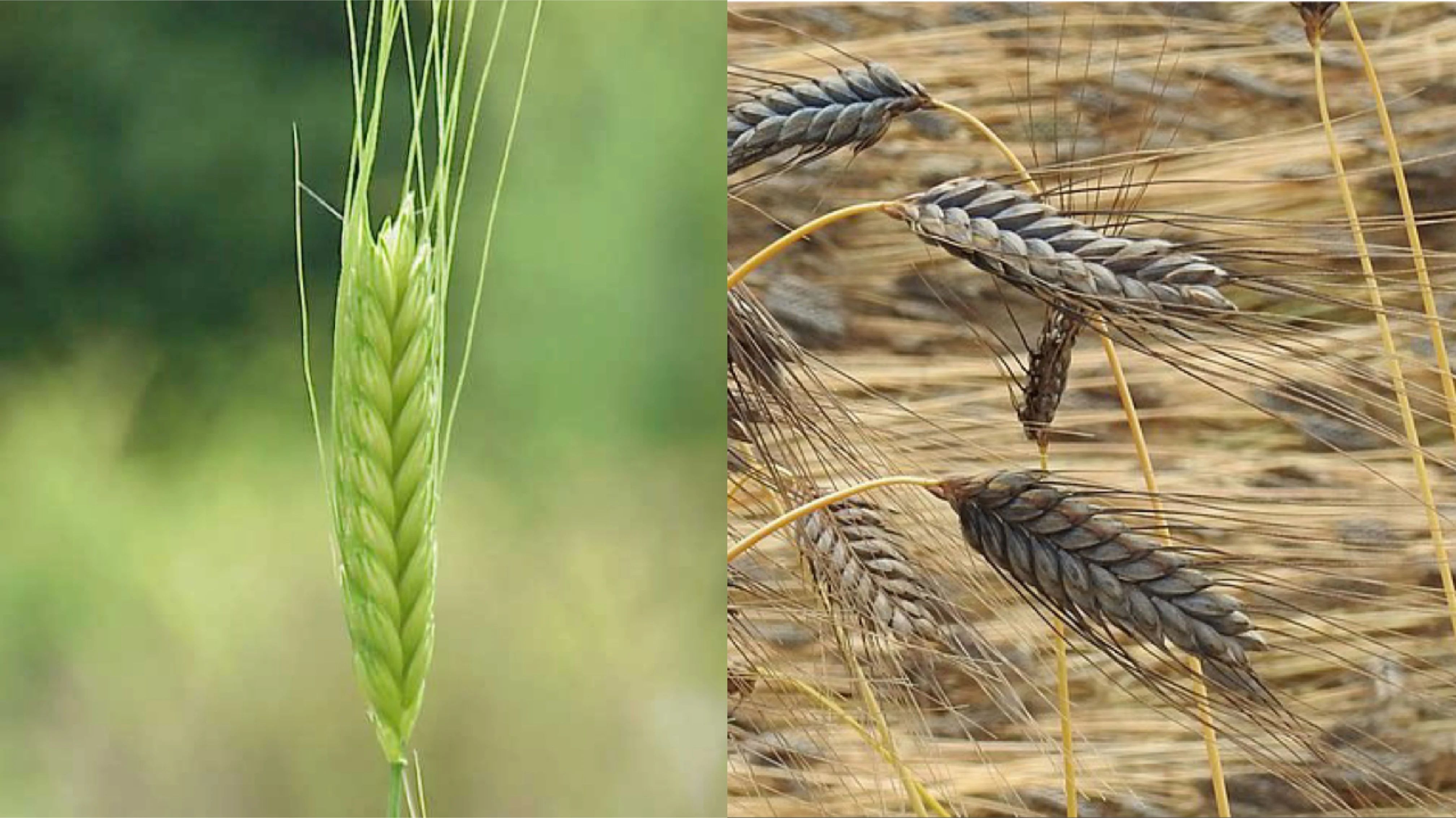 驯化小麦的“祖先”:一粒小麦(左)和二粒小麦(右) | 左:Kurt Stueber / Wikimedia Commons;右:Robert Flogaus-Faust / Wikimedia Commons