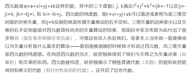 哈密顿觉得四元数的标量项可能表示时间。我们知道后来的物理学就是这样的,不过不是把时空简单地表示成q=ct+xi+yj+zk这样的四元数,而是写成(x, y, z; ict)的样子,将之理解为双四元数(biquaternion)。这是后话。哈密顿曾撰文Algebra as the science of pure time(作为纯粹时间之科学的代数),这个深刻的哲学思考是哈密顿的思想宝藏, 其对物理学发展的影响不可估量。
