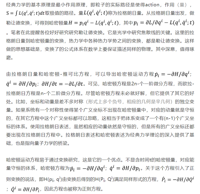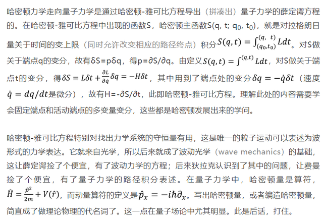 虽然拉格朗日和哈密顿力学是为了分立系统构建的,但是对于连续体系的研究也适用,电磁学、量子力学、量子场论都采用哈密顿力学的表述。到了1920年代,索末菲(Arnold Sommerfeld, 1868-1951)在他的Atomic structure and spectral lines(原子结构与谱线)一书中更是高度赞扬了哈密顿的理论。哈密顿的动力学理论不仅适用于经典力学,也可用于量子力学,一点也没有过时的迹象。哈密顿的理论是量子时代的基础物理理论。索末菲等人1916年的文章将量子化条件同力学的偏微分方程联系起来(link up the quantum conditions with the partial differential equations of mechanics)。至于波动力学的基本方程,即薛定谔方程,那就是按照熵公式S=klogW对哈密顿-雅可比方程的改造(参见拙著《量子力学-少年版》)。薛定谔云: The hamiltonian principle has become the cornerstone of modern physics … his famous analogy between mechanics and optics virtually anticipated wave-mechanics(哈密顿原理是近代物理的基石……他关于力学与光学的著名类比实际上预示了波动力学的存在),诚非虚言。今日的物理学习者,对待哈密顿的学问,还是应该系统深入学习才是。