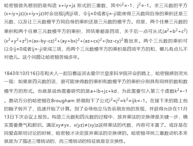 哈密顿伟大成就之一在于认识到所谓的复数不过就是有代数结构的二元数,或者叫代数偶(algebraic couple)。复数能表示二维空间里的转动,那么是否存在一个数学对象能自然地表示三维空间里的转动呢?哈密顿想把他的代数偶的概念推广到三重的情形(triplet)[4]。哈密顿发现不可能从微分方程出发构建triplet的数学理论(It is not possible to establish a theory of triplets from partial differential equations)。
