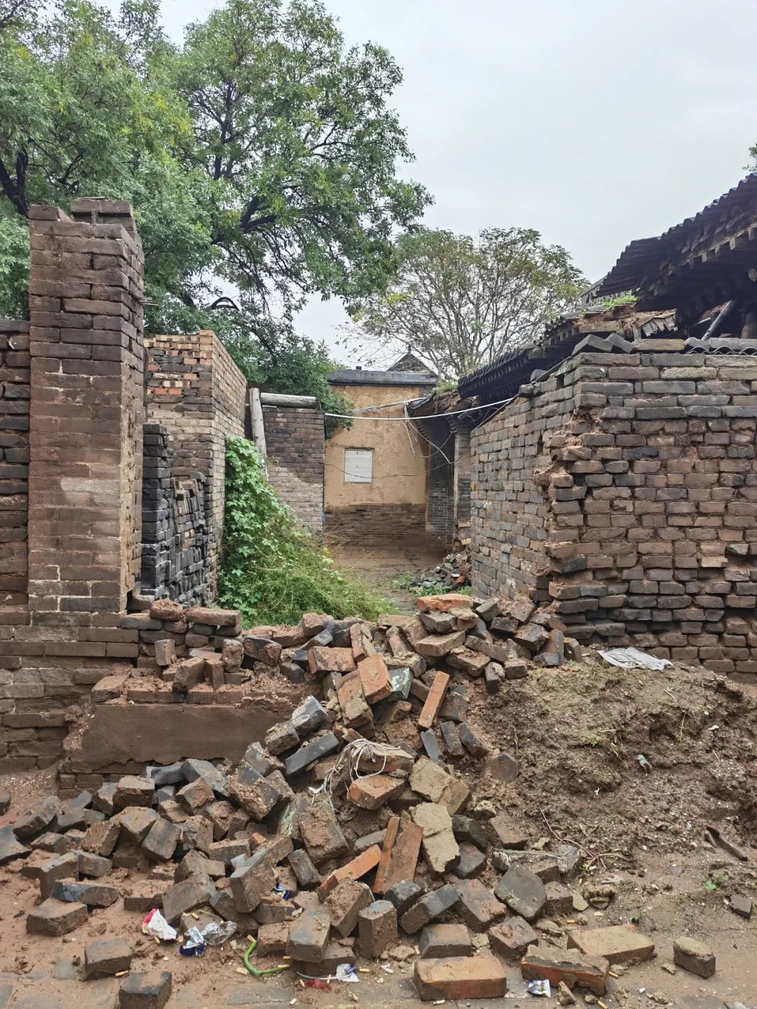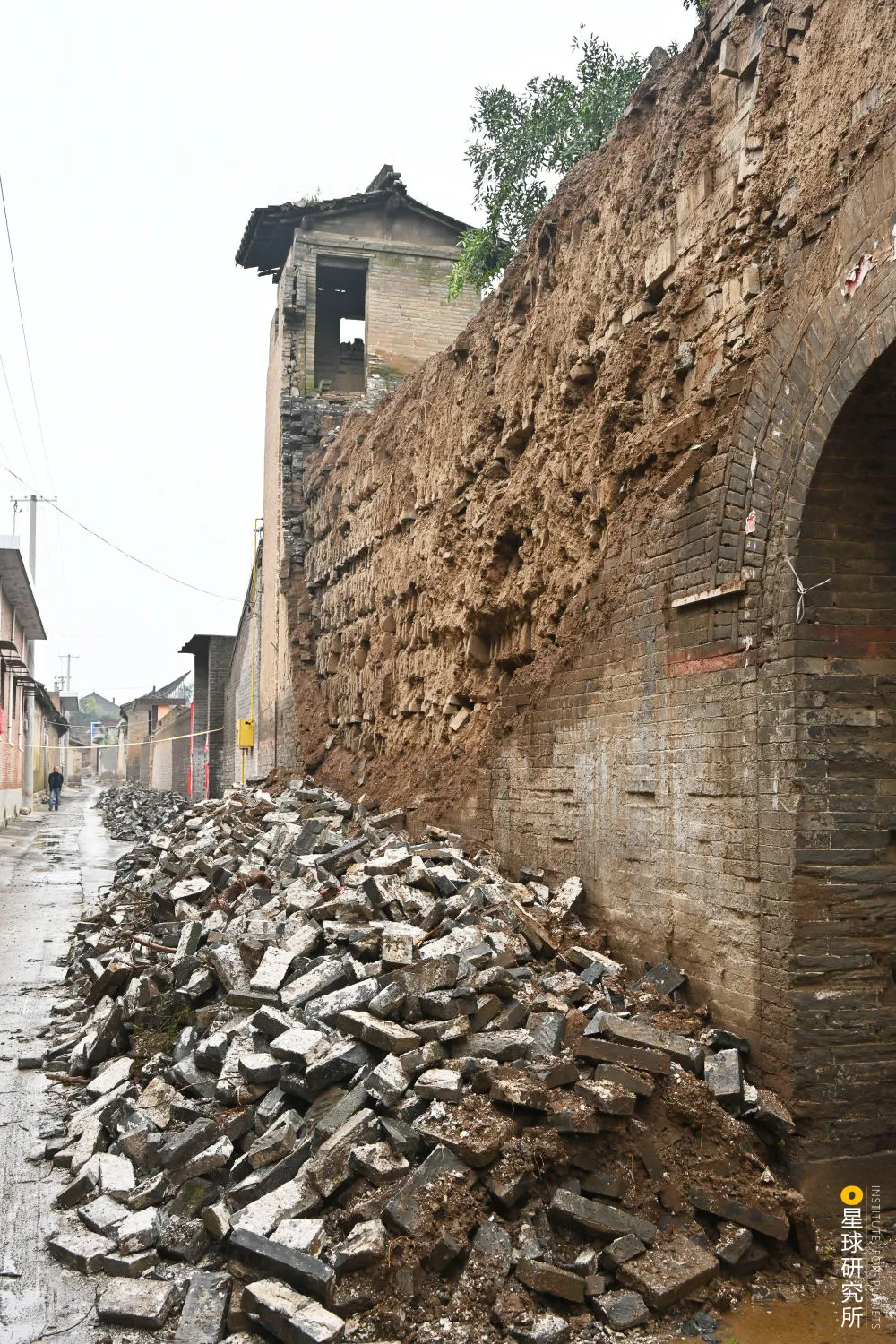 (2021年暴雨过境,山西襄汾县西中黄村进士院一处院墙外包砖脱落,摄影师@马毅敏)