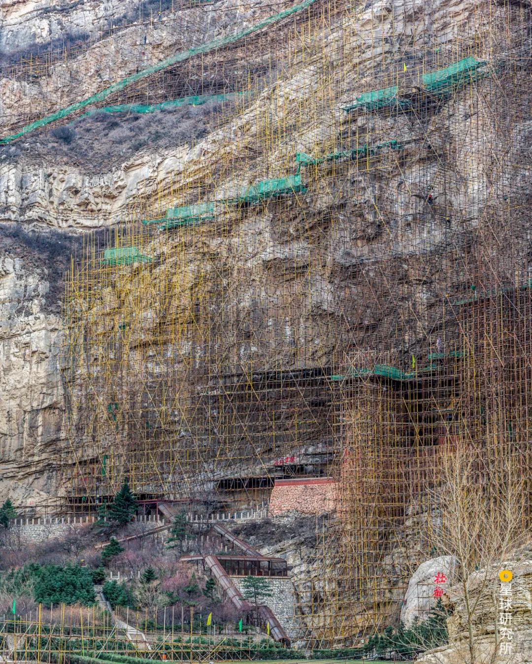 (2016年悬空寺危岩体加固工程,脚手架从山脚直抵山顶,摄影师@雾雨川)
