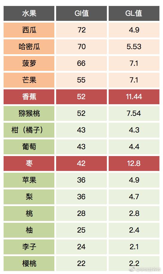 高GI的食物也不是说一定不能吃,比如西瓜,因为含水量多碳水化合物少,所以GL并不会很高。但也注意浅尝辄止。低GI的香蕉和枣,因为含糖量高,所以不太推荐给糖友们吃。