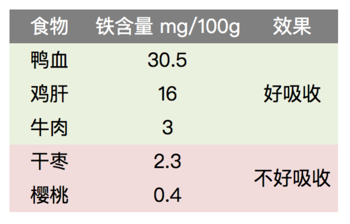 实际上,樱桃和大枣的红色是来自里面的植物色素,不是铁。它们本身的铁含量低,并且由于是非血红素铁,吸收效果也不好。