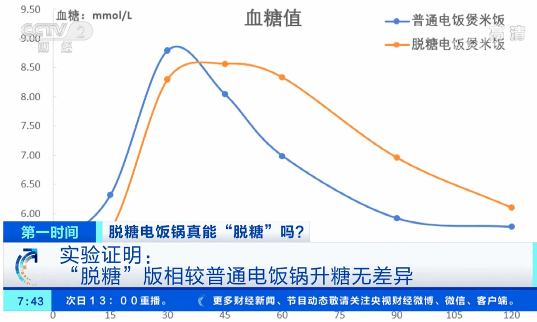 结果显示:普通电饭锅和脱糖电饭煲做出来的米饭,对血糖的影响差异非常小。普通电饭煲的米饭最高的顶点是8.79,脱糖电饭煲的最高顶点是8.56。[4]