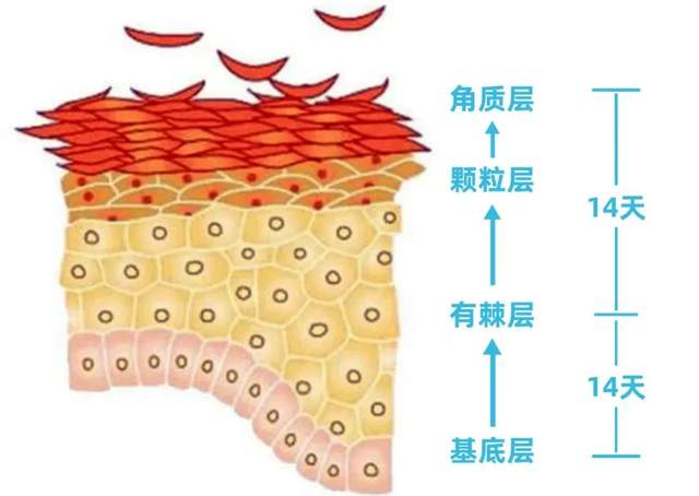 首先修复从皮肤的基底层开始,由基底细胞分裂产生新的表皮细胞,新生表皮细胞持续向外层移动至颗粒层,这一过程大约需要14天,然后再进入到角质层,最后在角质层表面脱落,这个过程又需14天,合计约28天左右。