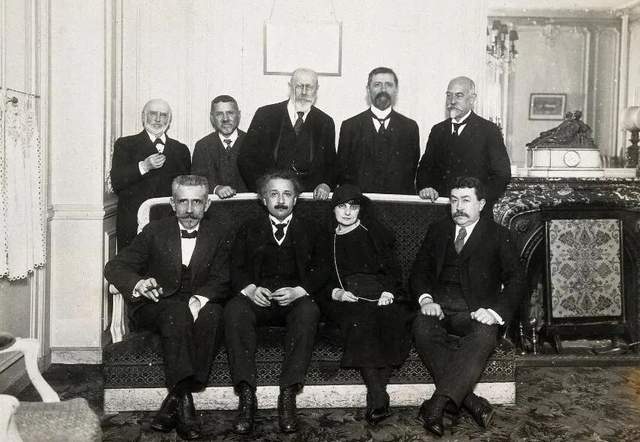 前排左起朗之万、爱因斯坦、诺埃勒伯爵夫人、潘勒韦,后排右二博雷尔 | 图源:wellcomecollection.org/