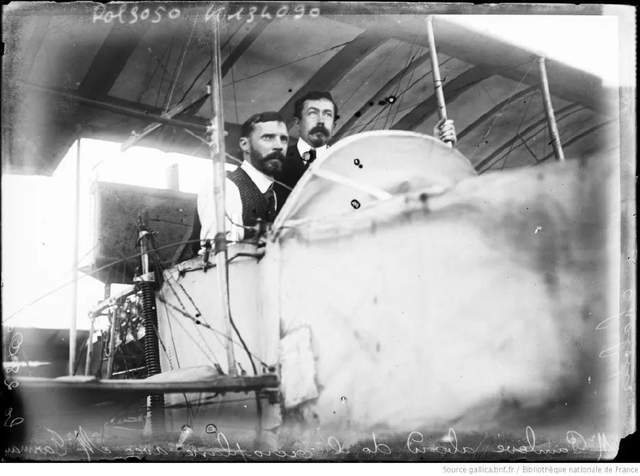 1908年10月28日,潘勒韦(右)乘坐法国飞行员Henri Farman驾驶的Voisin 双翼飞机 | 图源:https://gallica.bnf.fr/
