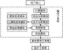 子系统通常还需细分为一些功能小模块。例如, 编译子系统(见图 )至少应包括接口模块、扫描模 块、语法分析模块、语义分析模块、类型检查模块、 完整性约束检查模块、授权检查模块、错误处理模块、优化模块等。