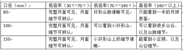 天文望远镜是一种比较复杂的仪器,它的参数有很多,比如口径、焦距、焦比、倍率、镀膜、寻星镜、赤道仪……菜鸟童鞋一定别被卖家炫出的各种名词搞晕,入门级爱好者就牢牢把住一点就好:口径和焦距(或者倍率)。这个没选好,其他的神马都是浮云。 口径,简单地说,就是望远镜镜筒的粗细,它直接影响观星的效果。口径越大,看得越清楚。 望远镜最核心的本事就是“看远处”。焦距是一台望远镜看家本领的直接体现,决定了望远镜的放大倍数,能让我们看得更远。注意!望远镜的焦距有两个,一个是物镜焦距,另一个是目镜焦距。一般来说,天文望远镜的物镜焦距是不变的,而目镜焦距是可以调节的。有些商家还配有多个目镜可供选择。物镜焦距与目镜焦距之比称为倍率,也就是放大倍数。当然,放大倍数越大,看得越清楚、越远,也就是说,物镜焦距越大越好。 小结一下:选望远镜要选口径大和物镜焦距大的,简单粗暴地说,就是选镜筒又粗又长的。不过,镜筒越粗、越长,望远镜的价格就会越贵,而且重量也是杠杠滴,对于我们志在四方的小天文爱好者,真是背着望远镜就已经累到cry,那么也就没力气看星星了。所以还是要根据需要,量力而行,选择一款适合自己的观星神器。下面以月亮为例,给出大概的参数,供君选择。
