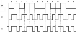 其中:a)为不归零码,b)为曼彻斯特码,又叫数字双相码。c)为差分曼彻斯特码,又叫条件双相码(CDP码)。它是改进型的曼彻斯特编码,其特点是在每一位周期的中间,波形都有变化,如果在两位周期交界处电平没有变化,则表示“1”:有变化,则表示“0”(在信号位中间总是将信号反相;在信号位开始时不改变信号极性,表示逻辑“1”:在信号位开始时改变信号极性,表示逻辑“0”)。