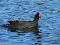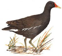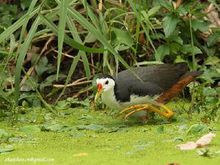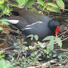 红冠水鸡,全身黑色,体型圆胖的秧鸡科鸟类了。嘴基部及前额呈红色,双脚为黄绿色,嘴尖黄色;在它们的臀部两侧,有大型的白色斑块,它们就是台湾湿地常见的红冠水鸡。红冠水鸡是普遍的留鸟,活动以鱼塭、水田及红树林等大面积的湿地或水塘,虽然外表和不会游泳的鸡非常相像,但可是游泳高手。在游动时,红冠水鸡的头部会不停的地向前伸展,而白白的尾部也会规律地摆动,看起来,就好像是只游在水面的黑水鸭子。通常单独或成对活动,繁殖后期。常见组成小家族群。喜在茂密的水草丛中穿梭。飞不高,少飞翔。活动于消晨和黄昏,以水生小动物、昆虫、植物种子为食。