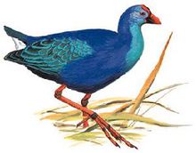 紫水鸡,体大(42厘米)而壮,紫蓝色,红色的嘴特形大,除尾下覆羽为白色外,整个体羽蓝黑色并具紫色及绿色闪光。具一红色的额甲。 虹膜红色;嘴红色;脚红色。咕咕咯咯叫个不停;另有带鼻音的号角声wak。分布于古北界至非洲、东亚地区、澳大利亚及大洋洲。亚种poliocephalus为云南西南部的罕见繁殖鸟,可能在西藏极东南部也有分布。云南西部、广西及香港有迷鸟越冬记录。栖于多芦苇的沼泽地及湖泊,在水上漂浮植物及芦苇地中行走。有时结小群到漫水的开阔草地、稻田或火烧过后的草地上活动。尾上下抽动。
