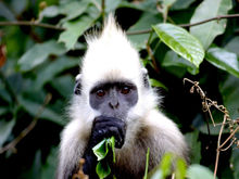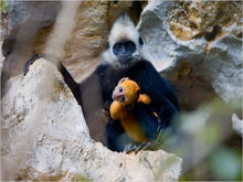 冠叶猴(presbytispileata)别名花叶猴,白叶猴、白头乌猿等属EN濒危动物,外形酷似黑叶猴的白头叶猴是我国特有种,属于国家一级保护动物。其头部连同冠毛及颈部和上肩均为白色。像戴一顶白色风帽,手、足背面也杂有白色,尾的一段为白色。白头叶猴是世界上25种最濒危的灵长类动物之一。主要分布在广西崇左附近。目前白头叶猴的总数已经达到了800只左右,研究价值仅次于于大熊猫。仅分布在中国的广西、贵州、重庆以及越南北部等地区。这是一种体型纤瘦的叶猴,头部较小,尾巴和四肢细长,体重5.5-7.9公斤。它全身体毛均为黑色,头顶有一撮竖直立起的黑色冠毛,两颊从耳尖至嘴角处各有一道白毛,形状好似两撇白色的胡须。雌性黑叶猴在会阴区至腹股沟的内侧有一块略呈三角形的花白色斑,这是区别雄性和雌性黑叶猴的主要特征之一。