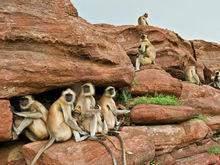 晚上白头叶猴一般要住山洞,瞧这就是白头叶猴住的山洞,从远远望去,我们用望远镜在它生活的环境里面寻找,很容易就能够发现在山洞的下面有比较深的颜色,这就是白头叶猴的一些排泄物。它长期住在这个山洞,到了晚上就在洞口排泄。所以时间一长,就很明显地在洞口的下方就有一些深褐色的这么一些排泄物22