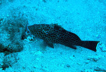 宝石石斑鱼,Epinephelus areolatus (Forsskål, 1775) ,鮨科石斑鱼属的一个物种。体长椭圆形;头中大,标准体长为体高之2.8-3.3倍。头背部斜直;眶间区窄,中央微突。眼较小,短于吻长。口大;上下颌前端各有2小圆锥状齿;上颌外列齿较大,内列齿绒毛状;下颌齿2列,排列疏松;腭骨和锄骨均具齿。鳃耙数8-10+14-16。前鳃盖骨后角具2-7个锯齿,下缘光滑。鳃盖骨后缘具3扁棘。体被细小栉鳞;侧线鳞孔数49-53;纵列鳞数97-116。背鳍鳍棘部与软条部相连,无缺刻,具硬棘XI,软条15-17;臀鳍硬棘III枚,软条8;腹鳍腹位,末端延伸不及肛门开口;胸鳍圆形,中央之鳍条长于上下方之鳍条,且长於腹鳍,但短於後眼眶长;尾鳍截形。头部、体侧及各鳍色淡,散布著褐色、黄褐色或黄色之斑点,最大斑点约等於瞳孔大小。胸鳍色淡,具暗色班点;尾鳍具白缘。