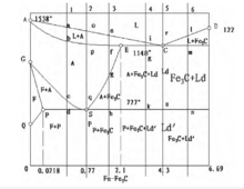含碳量在2.11%时,作为铸铁和碳钢的黄金分割点。碳含量在2.11%之前为碳钢。碳含量在2.11%之后为 铸铁。而碳含量在0.0218%至0.77%之间称为亚共析钢,0.77%至2.11%之间称为过共析钢。含碳量为2.11%为共析钢。碳含量在2.11%至4.3%,称为亚共晶白口铸铁,碳含量在4.3%至6.69%之间称为过共晶白口铸铁。碳含量在4.3%为共晶白口铸铁。2