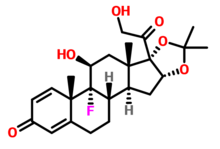曲安缩松(triamcinolone acetonide)又名曲安奈德,化学名为9-氟-11β,21-二羟基-16α,17[(l-甲基亚乙基)双(氧)]-孕甾-1,4-二烯-3,20-二酮,白色或类白色结晶性粉末;无臭。在丙酮中溶解,在三氯甲烷中略溶,在甲醇或乙醇中微溶,在水中极微溶解。分子式为C24H31FO6,分子量为434.49800,密度为1.33 g/cm3,熔点为274-278ºC (dec.),沸点为576.9ºC at 760 mmHg。