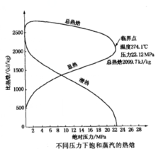 由下图可知,汽化潜热焓随压力增加而减少,显热焓随压力增加而增加。而总热焓在较低压力下最大,随着压力升高而逐渐减小,但压力达到临界点(22.56MPa,374.1℃)时,它降到最低点。