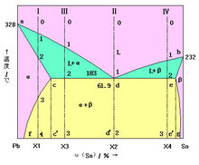 Pb与Sn形成的液溶体L相、Sn溶于Pb中的有限固溶体α相、Pb溶于Sn中的有限固溶体β相、相图中有三个单相区:L、α、β,三个双相区:L+α、L+β、α+β,一条L+α+β的三相共存线(水平线cde)。这种相图称为共晶相图。(Al-Si、Ag-Cu合金也具有共晶相图)