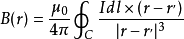 式中C为任一闭合面,即穿出任一闭合面的磁通代数和为零,回路上任一电流源Idl所在的点称为源点,其位置矢量用表示,需要计算磁感应强度B的点称为场点,其位置矢量用r表示。