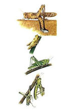 蝗虫的卵约21天即可孵化。 孵化的幼虫自土中匐匍而出,此时其外形和成虫很像,只是没有翅,体色较淡。若虫在最初的一、二龄长得更像成虫,但头部和身体不成比例。到了三龄长出翅芽,这是四龄翅芽已很明显了。五龄时若虫已将老熟再取食数日就会爬到植物上,身体悬垂而下,静待一段时间,成虫即羽化而出。 蝗虫的成虫及幼虫均能以其发达的咀嚼式口器嚼食植物的茎、叶。