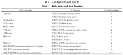 人体各活动部位(主要以关节为核心)的方向与角度,取决于关节的表面形态。它可决定关节移位的自由度。由于骨骼处于固定状态,关节的自由度不多于3个(少于机器人)。不同的关节具有不同的自由度(表1)。具有一个以上自由度的关节,可以使关节完成其最大可能的活动方向。如有3个自由度的骨盆和下颌关节,可以完成上下、左右、前后方向的动作。肩关节可完成人体坐标系上的3个方向活动:在矢状面上的弯曲与伸展;在前额面上的内收与外展; 沿着垂直轴旋转。人体各活动部位具有各自不同的活动方向与范围。