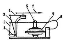 其中,1、2、3、4—传动机构;5—拉杆;6—波纹真空膜盒;7—指针;8—弹簧 空盒气压计的感压元件是外表呈波纹形、内为真空的特殊合金金属膜盒。当压力增大或减小时,膜盒面相应地凹下、凸出,通过传动机构将这种微小位移放大后,驱动指针指示出当时测点的绝对压力值。