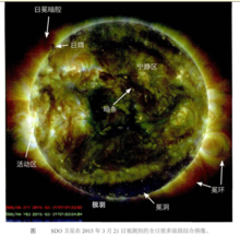 图显示的是SDO卫星(在本章的后面我们会介绍这颗卫星)观测到的多波段综合全日面图像,显示了太阳的宁静区、曼洞和活动区三个区域以及太阳大气中的部分常见结构。
