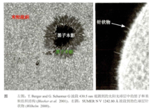 一般情况下,一个成熟的黑子由本影和半影组成。本影区域的亮度比半影区域低4~6倍,磁场强度也要比半影区域强。同时,太阳黑子在稳定的状态下也并不是完全没有任何活动的。我们可以在太阳黑子中观测到不同周期的震荡和波动活动,也可以发现一直不间断的流动活动。另一方面,太阳黑子经常成对或成群出现,形成黑子群。