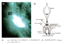 相比于相对变化没有那么剧烈的静态热晃环,另一类变化剧烈的热环——耀斑环则更多的和太阳的瞬时爆发活动相关联。耀斑环是在耀斑过程中形成的髙温増亮的环状结构。它们能够在很大程度上反映耀斑过程中的磁场和能量变化,是研宄太阳耀斑活动的一个重要参考因素。耀斑环的生命周期一般都比较短,平均在15分钟左右。一般认为,耀斑之后的紫外辐射主要来自磁场重联后耀斑环的加热。通过对多个耀斑事件的极紫外后相的分析中,则阐述了更为复杂和精确的耀斑环加热和冷却过程。