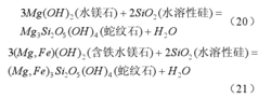 水镁石是岩石中镁质端元反应的产物(反应式(4)),多为片状,常与蛇纹石共生。在低温条件下,其中的 Mg2+易于被 Fe2+取代,从而形成铁水镁石(反应式(1)和(2))。由于水镁石易与富硅流体进一步反应转变为蛇纹石(反应式(20)和(21)),因此在贫硅富镁体系中才能稳定存在。Beard et al5认为水镁石-蛇纹石在流体体系中可以起到硅的缓冲剂作用,在 200ºC 缓冲效果位于石英缓冲线下面三个单位;而铁水镁石-磁铁矿则可作为氧缓冲剂,其效果相当于或低于铁-磁铁矿的氧缓冲剂。10
