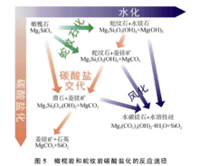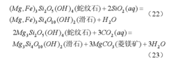 碳酸盐矿物碳酸盐矿物也常作为蛇纹石化作用的产物出现(图 5)。一种方式是由于富 Si O2流体交代白云石,在形成蛇纹石的同时,也生成二氧化碳和方解石(反应式(11)和(12));另一种方式是橄榄石等富 Mg 矿物被富 CO2流体交代,可生成菱镁矿(反应式(13)和(14),图 1)。另外,菱镁矿等碳酸盐矿物也可在蛇纹石化之后的蚀变过程中出现,主要是由蛇纹石、水镁石或滑石进一步与流体中的CO2反应而生成 (反应式(23)-(25)和图 2),这在深海或大洋蛇纹石化的橄榄岩以及造山带超镁铁质岩中比较普遍,多以细脉或碎屑基质形式出现[45][68]。这种通过消耗 CO2而生成碳酸盐矿物的方式,近年