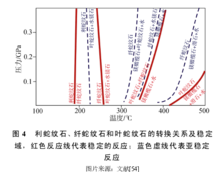 滑石一般与斜方辉石的蚀变直接相关 (反应式(4)),常沿裂隙发育,交代斜方辉石矿物而形成假晶结构。滑石和水镁石相反,在富硅少镁条件下易于稳定。这是因为滑石可以由蛇纹石与水溶性硅或二氧化碳反应生成(反应式(22)和(23)),因此,在自然样品中,滑石也可作为蛇纹石化后的次生矿物存在11。