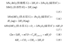 磁铁矿磁铁矿是岩石中铁质端元反应的产物 (反应式(15)),常呈细小颗粒分布于蛇纹石的边缘[58]。已有研究认为,磁铁矿的出现与岩石或矿物蛇纹岩化的程度有关,比如,在蛇纹石化作用不完全的大西洋橄榄岩中,磁铁矿很少出现,而橄榄石蚀变所形成的蛇纹石则富 Fe;又如,马里亚纳前弧南部蛇纹石化橄榄岩中缺乏磁铁矿,被认为是蛇纹石化作用还未进行完全11。Toft et al.15认为,蛇纹石化的最初阶段只生成富 Fe 蛇纹石和富Fe 水镁石(见反应式(1)和(2)),磁铁矿是在进一步蛇纹石化过程中才生成(反应式(16)和(17))。除此之外,影响磁铁矿生成量的因素还有温度、SiO2的活度和蛇纹石的重结晶以及成分相互置换作用12。形成磁铁矿的同时,铁质端元的二价铁被氧化为三价铁,水中的氢被还原为氢气 (反应式(15))。在一氧化碳或二氧化碳存在的环境中,由于费-托聚合反应,碳可被还原为甲烷和其他烷烃化合物以 及 不 定 形 的 碳 酸 盐 相 ( 反 应 式 (18) 和(19))。期间氢气的氧化和甲烷的生成所产生的能量有利于海洋微生物的生存。10