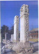 碑首在古代石碑上,我们见到的多数石碑碑首正是《营造法式》所规定的“盘龙”形式。但是盘龙的多少却视碑身的厚度而定,因此并非都是六条。陕西乾县唐代乾陵有一块石碑碑身特别厚,其碑首两侧各雕有四条龙,共计八条盘龙,不少碑身较薄的石碑也有两侧各两条共四条盘龙的。碑首上龙的盘曲姿态也并非都保持一种形式,除了龙头在碑首两侧,龙体在正面盘曲的以外,也有的龙头跑到碑首正面上来了,左右两条龙头相对,中央有一颗宝珠;也有少量的石碑碑首外形如法式中笏头碣的形状,呈简单的方形而双肩抹角,但是在正、背两面仍用雕龙装饰。有两条单龙相对戏笠珠者,有数条游龙翻腾于云中者,也有用一条巨龙盘结在碑首,龙头突出于碑首中央者,形式很自由。这种盘龙的碑首装饰雕刻多喜欢用高雕,高低起伏很大,造成很强的阴影,从而突出龙的造型。山西五台山龙泉寺的石碑碑首甚至用了透雕的技法,它所产生的强烈效果和龙泉寺石牌楼的风格很一致。石碑碑首除了大多数采用盘龙的形式之外,也有用房屋屋顶形式的。