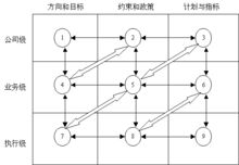 战略规划是分层次的,正如以上所说战略规划不仅在最高层有,在中层和基层也应有。一个企业一般应有三层战略,即公司级、业务级和执行级。每一级均有三个要素:方向和目标、政策和约束、以及计划和指标。这九个因素构成了战略规划矩阵,也就是战略规划的框架结构,见下图。
