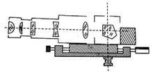 (2)反向光学对点器法:反向光学对点器可以用来测定相对于引张线的偏离值。 一般需要专门设计制造, 也可以利用一个望远镜加上五角棱镜后改造而成。 为了测量光学对中器中心轴偏离引张线的距离, 把望远镜及五角棱镜装在滑块上,滑块在轨道上移动,其移动量用一只百分表测量。轨道固定在坝体上与测线垂直。如图 6 所示。