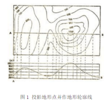 ③ 将基线(A—B)与图面上(A—B)平行对准,将A—B与地形等高线的一系列交点,垂直投影到A—B上方相应高程的位置上,从而获得一系列的地形投影点,然后用圆滑曲线,逐点依次连接而成剖面图的地形轮廓线,井在其上方相应位置标拄地物名称(山峰,河流、村庄等),则成为地形剖面图。